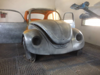 Nå er bilen sprøytet inni og filler er lagt utvendig. Da gjenstår pussing av filler i neste uke og lakkering utvendig mot slutten av uka Glad