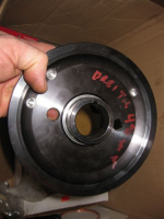 For at jeg skal kunne bruke T1 reim hjul, måtte vi dreie ned til 48mm fordi vannbokser blokka har simmering mot reimhjulet. Her ser du også et par merker etter avbalanseringen som er gjort av Svein T.