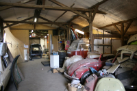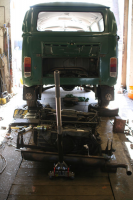 Når jeg tenker på det, er det et under at jeg kom så langt som jeg kom. Etter å tatt en nærmere titt på drivakslen, viste det seg at leddene og lagerene var ødelagt (noe som forårsaket en knakking når man kjørte over en kant eller lignende). Jeg har tatt den ut, og har bestilt nye lager, mansjetter og skruer 80 € x4  . Jeg har også hatt en lekasje i den ene forgasseren noe som gjorde at det stinket. Vi tok ut motoren på lørdag (med litt strev da det er en typ4). Måtte løse støtfangeren bak og fjerne masse av blikkene som er skrudd fast på motoren. Det er hos denne karen jeg har vært de siste dagene og tatt ut motoren. Han er en folkevogn fanatiker kan man vel si. Han har ikke kjørt annet en luftkjølte biler på 25 år.. Til høyre er arbeidsbilen hans, en av de.. Koselig verksted med mye biler