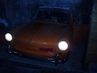 Her er han på plass i garasjen, legg merke til røyken... miljøbil frå the 70's!