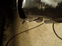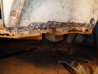 Betre bilde av det,, Denne falsen er på sjølve kanalen og fester den til forsterkingsplata, eller rear cross member so da haita på fint. Legg merke til att eindel av punktsveisa er oppeten av rusta.. Det skal nevnast att denne falsen fortsetter til venstre og INN imellom ytre og indre innerskjerm plata.