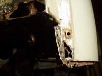 Masse boring framme og! Legg merke til dei punktane rett under dørstolpen. Ei malingskrapa er fin å skilla platene med etter boring, unngå bruk av meisel då den krøllar sund den tynne innerskjermplata.