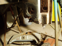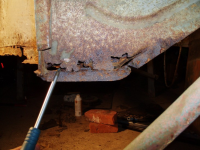 So tar me ein kikk over på andre sida av bilen, som er den bedre sida. Der ser me eit hol i gjennom forsterkingsplatene og inn i kanalen. Frå og med 69modellen var det eit inspeksjonshol bak kanalen, og det skal vera ein plugg over holet. Pluggen detter av, vatn og drit kjem inn, og elendigheiten er eit faktum, som på den dårlege, høgre, sida..
