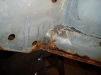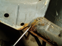 So tar me ein kikk over på andre sida av bilen, som er den bedre sida. Der ser me eit hol i gjennom forsterkingsplatene og inn i kanalen. Frå og med 69modellen var det eit inspeksjonshol bak kanalen, og det skal vera ein plugg over holet. Pluggen detter av, vatn og drit kjem inn, og elendigheiten er eit faktum, som på den dårlege, høgre, sida..