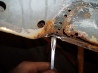 Masse boring framme og! Legg merke til dei punktane rett under dørstolpen. Ei malingskrapa er fin å skilla platene med etter boring, unngå bruk av meisel då den krøllar sund den tynne innerskjermplata.
