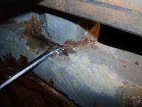 Eit(dårleg) bilde av kanalen lenger ned. Skrujernet peker på kanten av ei ekstra forsterkingsplate som ligg ytterst bak kanalen her. Totalt er det også her 3 plater utanpå kvarandre,, er det rart det rustar!?