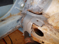 Betre bilde av det,, Denne falsen er på sjølve kanalen og fester den til forsterkingsplata, eller rear cross member so da haita på fint. Legg merke til att eindel av punktsveisa er oppeten av rusta.. Det skal nevnast att denne falsen fortsetter til venstre og INN imellom ytre og indre innerskjerm plata.