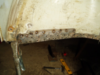 På innsida av dørstolpen bak, ligg ei plata som er bretta ut over kanalen, Og den er heilsveist rundt heile kanten. Tysjen visar sveisen, som er begravd i karosserikitt og gammal maling