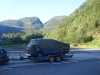 DSCF0624.jpg (146.82 KB. 733x550 - vist 356 ganger.) Komt ned att av dei siste store bakkane, fortsatt i god behold(med kun eit partrehundra kg overlast..godt da ikkje e poleti langs norske vegar, dei sitt vel på kontore og ser på vm?) Utleige hengar med eit lys system som lever sitt eige liv, og brems på 1. hjul  Godt passaten har bremsar som funka.. etter ca 20 minuttar med bremsing, deriblandt 1 av 4 hjul med bremsebelegg igjen so vert resterande hjul VARME! skrur du av eit hjul kan du fint grilla hambis å korv te heile familien