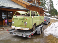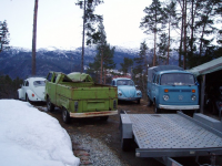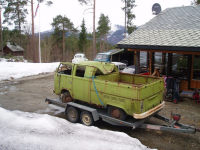 Vel framme på Bygstad (ner Førde) kai møtte me ein kjent spygrøn farge og nesten lika mykje brunt Glad Selgaren Knut Erik var hygglig og hadde trucken klar te lessing, so da va veldig sutalaust å få bilen oppå!