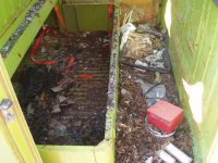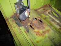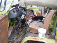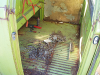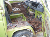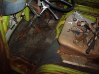 Golvet i kabinen husa mangt slags drit og glassbrot.. ja for glasbrot er det mykje av her! ALLE glas som kan knusast er knust! Helsikes dretonga so berre laga helvete me herverket sitt Då bilen vart plassert i skogen etter avskilting i 88, so var han heil og vart kjøyrd opp. Men i mellomtida har nokon komt på att dei skal ta traktor og frontlastaren og traspa taket.. i tilleg knusa alle lykter sjølvsagt..
