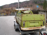 P1017650.jpg (85.4 KB. 733x550 - vist 387 ganger.) Vel framme på Bygstad (ner Førde) kai møtte me ein kjent spygrøn farge og nesten lika mykje brunt  Selgaren Knut Erik var hygglig og hadde trucken klar te lessing, so da va veldig sutalaust å få bilen oppå!