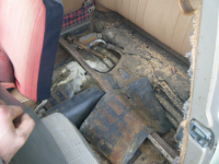 Under baksetet view.. mykje batterisyra, mykje musadrit og litt rust, men det er ikkje mykje hol i golvplata!