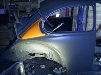 Alt for kaldt til å få unnagjort siste rest av grunning. Har lakk liggende klart, samt nesten ferdig med skissing av dash, midtkonsoll og høyttalerkasse bak.