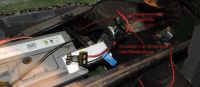 Bilder av koblinger til startmotoren (ledningen fram til sikringsboksen, rød ledning med svart strømpe, er koblet på rett plass, selv om det ser ut som den er koblet til samme kontakt som tykk kabel til batteri +)