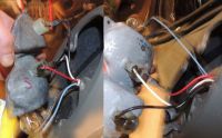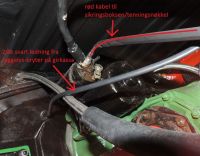 Bilder av koblinger til startmotoren (ledningen fram til sikringsboksen, rød ledning med svart strømpe, er koblet på rett plass, selv om det ser ut som den er koblet til samme kontakt som tykk kabel til batteri +)