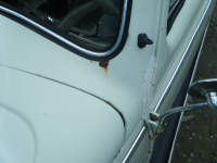 Rust i eine hjørnet av frontruteramma, bør egentlig ta ut ruta og gå over rusta der. Ogso samme problem under sideruta bak, venstre. Denne rusta kjem av lakkbobler.