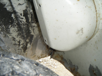 Rusta lappa på venstre sida og, fleire lag med maling, tectyl og zink omeinan her..