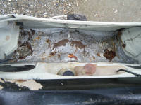 Antal registrerte rusthol: 4(+ reservehjulsbrønnen) Hol på kanten av førarkanalen, lett fiks. Hol mellom skjerm og stigtrinn høgre, grei fiks. Lite sprekk bak gasspedalen i golvet og so er det noko rust i innerskjermen bak på høgre side på den kanten som danner hjørnet under baksetet. Men det er ikkje mykje. Brønnen framme er egentlig kaputt og bør skiftast