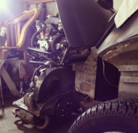 MEN! 1 stykk motorluke demonteret, åndeboks tilkoblet, olie påfyldt senere siger starteren KLIKK og svinghjulet står garanteret fast i girkassen. Ja ja, da er det jo bare ud med motoren igen (hurra for åbent motorum) men da jeg setter jekken under motoren ser jeg en dråbe olie under lokket til oliepumpen... Så FØR motoren har dreiet rundt lekker den fra remhjulet.