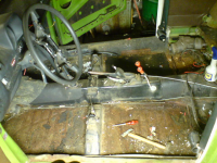 Spørsmålet er, hva skal jeg gjøre inni der, skal jeg sprøyte inni alle steder med rustmelk og satse på at det går bra, kappe ut hele siden på bilen og bytte med en bra bit, eller dumpe hele karosseriet og finne ett bedre?