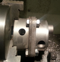 Fant også en gammel pumpe som jeg skrudde sammen med den nye for å kunne spenne den opp i dreibenken.