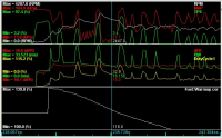 For de uinvidde så viser dette bildet at de to-tre første gangene jeg gir gass (grønn graf i det øverste bilde) så responderer turtallet (hvit graf), men etter noen sekunder slutter motoren å svare på gasspådrag. Den nederste hvite grafen viser After Start Enrichment, og det kan tyde på at så lenge ASE legger på 20-30% fuel så svarer motoren, men når den nærmere seg 100% får den alt for lite.