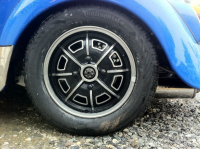 Fikk en MMS av Kåre i går. Nå har Putte for første gang fått testet sine nye Porsche Pedrini felger fra 1972. Må legge på 6 mm spacer skiver da felgen går borti caliperen bak og nedre infestning til fjærbeina foran. Skal legge ut noen flere bilder i morgen.