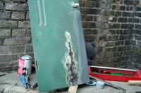 Et større hull som måtte lappes, brukte deler av lasteromsgulvet som reservedel. slipt og grunnet: