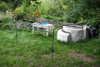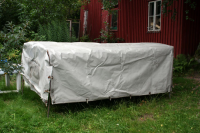 jo takk. når man ikke har noe valg er det ikke vanskelig å være motivert. Kjøpte et kapell til Håkon i sommer. Duken er i god stand, trenger bare å sy på bakluka + noen småting. Gleder meg til å se denne på bilen. Bilen i danmark og kapellet i Norge, så får vente litt til.. Har vasket og pakket vekk duken. Her er den bare slengt over stellet: