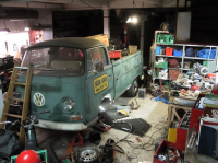 haak_149.jpg (43.94 KB. 700x467 - vist 597 ganger.) Motoren ute og klar til montering av eksos. Dette tok litt lenger tid enn forventet da vi måtte sveise om hele eksosen, fordi den var 2 cm for kort.. Trodde denne skulle passe som fot i hose, er jo tross alt original vw..