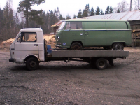 Hjelper ikke en gang om jeg knekker armene mine når jeg ikke har penger til å lage ny bil. Dette er nok kroken på døra for meg. Jeg rydder i alle fall unna mens jeg fortsatt har bilen. I dag gjennomførte jeg en av mine vanskeligste operasjoner: Laste boble med kun bakhjul, hvorav det ene var flatt, med bare enkle midler. Det gikk dette også.