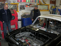 På plass i garasjen, nå står motor og taktrekk for tur. En annen T34 eier har kommet for å sjekke resultatet av lakkeringen, og det er meget bra.