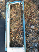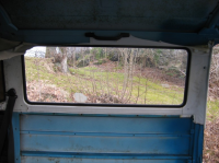 Skyvedøra er med vindu men uten lås, glidere og dørtrekk. Ser ut til at pakningen rundt vinduet fortsatt holder tett, så eg trur ikkje det er nokon stor overraskelse i profilen under der heller. Vanskeleg bilde, men beskjedent med rust under. Ser fin ut mht bulker. Skal me sei frå 250,- og oppover ?