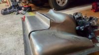 Må også lage til noen skvalpe plater, nipler for tur/retur (noen som har tips om plassering, størrelse osv?) og modifisere bensinmåleren. Tanken ble dyppet i et basisk bad på jobb og ser derfor ny ut, satser på å få noen der til å sveise/sølvlodde og trykkteste den.