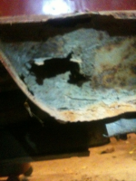 Begynte igår med å strippe ned bilen, og da dukket det opp noe ekstraarbeid. RUST!!!! Rusta på skjermene var jeg klar over, men det som kom fram når skjermene ble skrudd av var jeg ikke klar over, men no guts, no story!!! Alt kan fikses.