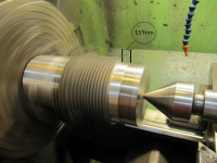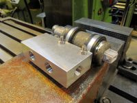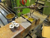 Nå som blokka er på spec, gjenstår det å kjøre foringer: Oppspenningsverktøyet jeg lagde for noen uker siden er nå spent opp i dreebenken og klar for action for første gang