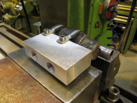 Ref. konverteringa: Oppdatert arb.-tegning for headstuds-hullene kommer litt senere. Stay tuned. Ble litt mer maskinering i kveld. Denne gangen på EFi-fronten. Sålenge jeg har kjørt med innsprut har det hele tiden vært med to dobble individuelle spjellhus. Dette har fungert greit, men mangelen på en tomgangsregulator i plenum har vært litt irriterende. I dag bestemte jeg meg for å løse dette problemet ved å integrere en IAC sammen med "to dobble". Tomgangsregulatoren "in question" er en Bosch 0 280 140 505, og vil bli styrt av en egen funksjon og driver i Megasquirt-systemet. Intensjonen er å lage en manifold som IAC-en kan skrus fast i, for deretter å rute luft videre til hvert spjellhus. Her er utgangspunktet. En ganske enkel alublokk: