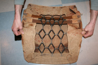 Over på seteryggen. Må få lagd skumgummi ferdig på begge to. Lagd kiler så man får litt mer sidestøtte i korsryggen. Så åpner d seg mer opp mot toppen. Skummet limer jeg til noen gulvtepper av sisal, som igjen er festet til fjærene med hog-rings