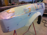 Han har kjøpt seg eget slipeutstyr så han gjør alle sparkling og sliping i min garasje, og blir flyttet til lakkverkested når det skal grunnes og lakkeres.
