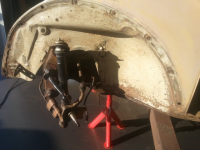 innerskjermane dine ser usedvanlig bra ut. skal ikkje mykje innsats til for å få desse på stell! der du manglar muttrar so funkar da greitt å skru ein mutter innpå ein bolt, og ta tak i bolten med ei sjølvgripstong. so held du mutteren innom kantan på karosseriet og punktar den einplass. so justerar du så bolten står rett i forhånd til plato. og punkter fleire plassar heilt til det er tett. bør helst bruka orginal 4kanta mutter men går an med vanlig og dersom du ikkje har