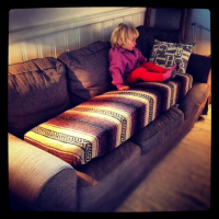 Her prøver lillemor i huset den nye sofa'n vår... Gliser