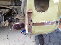 Førerdøren var veldig rusten nederst på innsiden, så jeg kuttet vekk rusten og banket til en ny del og sveiset den på. Her er bilde etter sliping med vinkelsliper:
