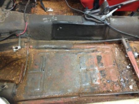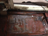 Pusset rein dørken med stålbørste på drillen, og der kom det frem noen plater som har vært sveist i tidligere på begge sider. I områdene rundt disse platene er det små hull her og der