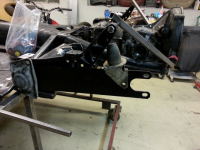 2013-03-27 23.32.12.jpg (87.73 KB. 640x480 - vist 412 ganger.) Slipte dessverre ganske mye av brakettene for at jiggene ikke skulle stå i spenn. Det viser seg nå at disse jiggene definitivt ga meg en falsk trygghet. På begge sider fikk jeg en diagonalfeil på målt til ca 996 mm, hvor det skulle være 1000mm. (600x800x1000mm trekant) Måler paralelt med torsjonsrøret, og paralelt med bremseskivene.