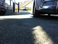 Og har fått meg nye felger , med mindre profil Ihåp med og få kunne svinge . Fikk endelig hjula ut av hjulbuen , men idet jeg skulle kjøre utav garasjen hørte jeg en ekstrem ulyd og la meg under og såg dette :