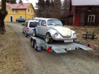Planen på kort sikt er å få bilen EU-godkjent, den har stått en stund så jeg kjører den på kontroll på torsdag og ser hva som eventuelt dukker opp. Har tatt det opplagte, og kjørt den noen kilometer for å få brukt litt bremser og løst opp litt. Satte på den originale sølv bakskjermen som er litt rufsete, men syns den var penere enn den blå. Da er det lik patina over hele bilen, om ikke annet.