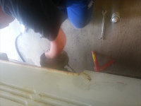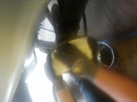 Morten skifter bremserøret over girkassa. Greit med hull i planet men fortsatt litt trang å komme til...