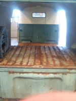 I kveld tok jeg den med på jobben for å begynne å grave litt. Jeg vasket den for første gang på mange tiår, og renset den innvendig. På gulvet i varerommet lå det to lag med gulvbelegg, et orangt 70-talls teppe, og et lag med sponplater. Det er vel unødvendig å nevne at dette har sørget for at gulvet stort sett har vært vått hele tiden. Gulvet er derfor ganske rødt, men ikke så fullt av hull. Fikk også vippet ut bakruta, og lagt film på den. Jeg kjørte også strøm på bilen, og motoren gikk faktisk rundt etter alle disse årene. Det skal nok litt mer til for å få den til å starte.