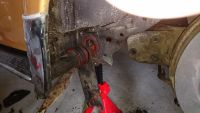 På venstre side ville ikke plata løsne slik at jeg fikk justert ytre splines, så da var det av med fremkant av forskjermene og ut med hele driten. Etter litt kakking og smøring var vi klar og justeringen ble 4 innesplines ned og 4 yttersplines opp, noe som skal tilsvare en heving på 2,2 cm.